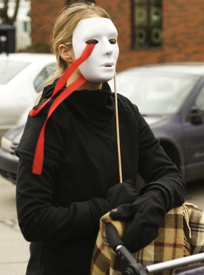 Large puppets of Canadian Prime Minister Stephen Harper, Colombian President Alvaro Uribe Velez and paramilitaries mingled with protesters. Demonstrators held white masks with flowing red streamers to represent the victims of Colombia’s state-supported armed violence.