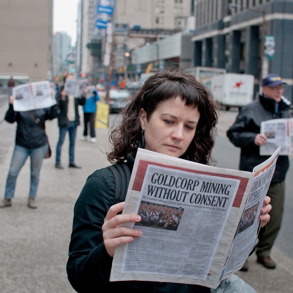 Brandishing large caricature-size newspapers and hand-crafted headlines, 30 or so protestors marched from Goldcorp’s headquarters in Toronto to Dundas and Yonge intersection where they intermittently posed at the intersection holding out headlines pointing to Goldcorp’s poor environmental and human rights records throughout Mesoamerica, and the recent insider trading scandal involving chairman Ian Telfer.