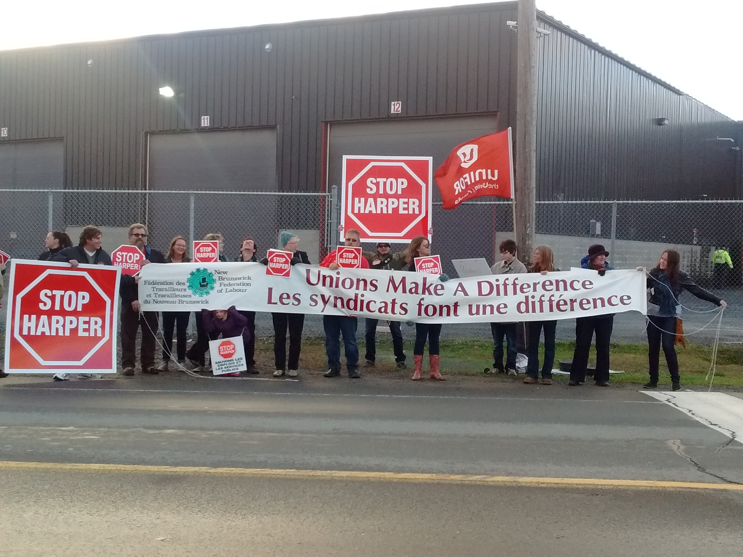 Harper opponents rally outside his late campaign stop to support Conservative MPs Keith Ashfield and Rob ...