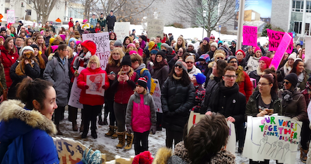 Close to 500 people gathered in front of City Hall in Fredericton on Saturday, Jan. 21st, 2017, at 1 pm, to show solidarity to the Women’s March organized in Washington, D.C., in reaction to the new U.S.’s president’s blatant disregard for women’s rights.