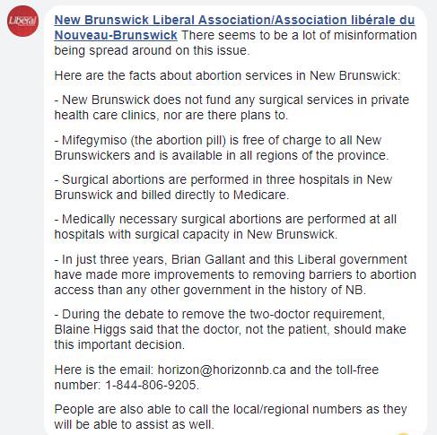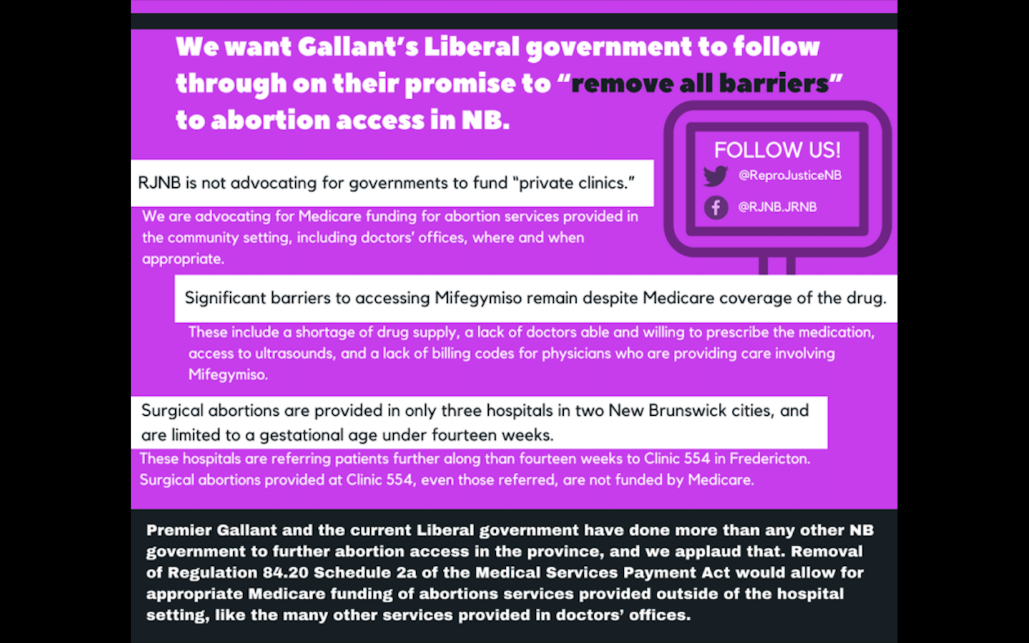 Today, Reproductive Justice NB produced an info-graphic that responded to the NB Liberal Association’s post about abortion access. The New Brunswick Liberal Association took to social media recently to clarify what the association said was misinformation about abortion access in the province. The post is reproduced here: