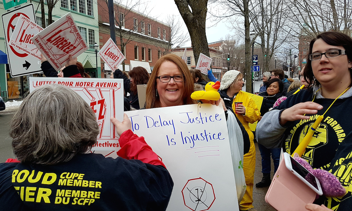After 28 months without a contract and consistently worsening work conditions, a near unanimous strike mandate was given by union members to the CUPE contract negotiators a week before the rally. The union members hoped the strike mandate would prompt positive movement by the management of the New Brunswick Association of Nursing Homes to solve these issues. However instead of talking with the union, the government reacted with a court injunction that prevents any strike action until March 19.