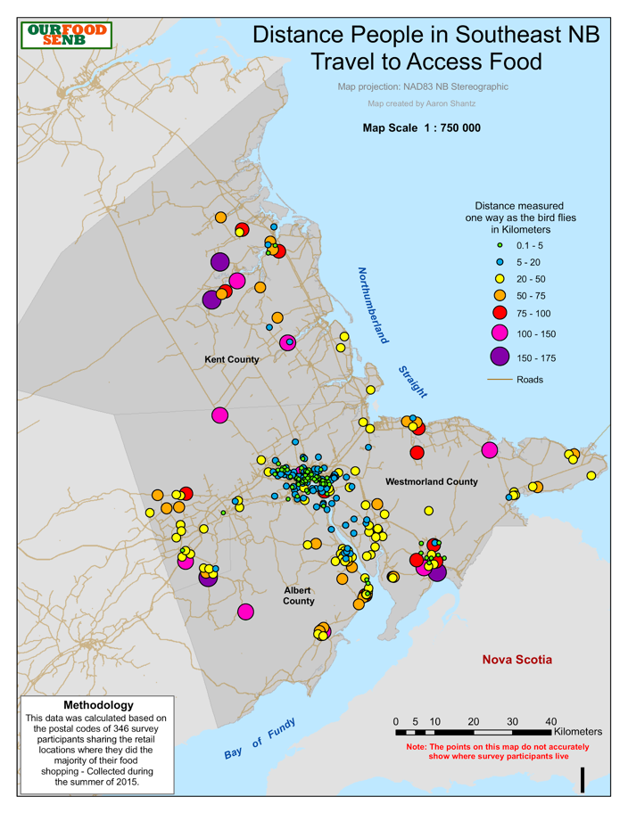 New Brunswick has a large rural population where distance and geographical isolation can be an obstacle when it comes to food services. A map by Our Food SENB highlights the distance that residents of southeast New Brunswick have to travel to access food, showing the difference between rural and urban areas. While those living in rural areas generally must travel farther, food deserts exist in more urban areas too.