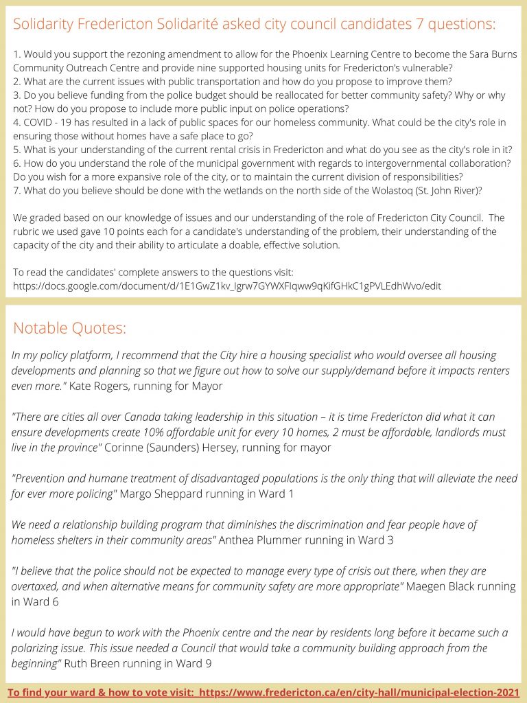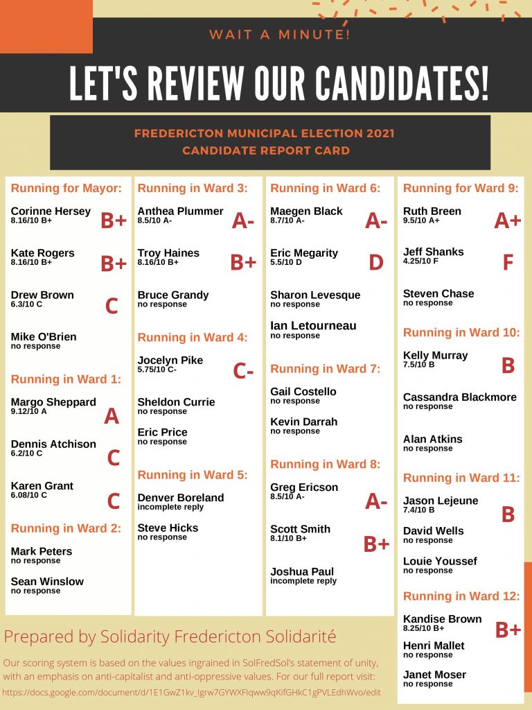Solidarité Fredericton has released a report card on where candidates in Fredericton’s 2021 municipal election stand on issues of concern to them, including housing, transportation, the police and wetlands protection.