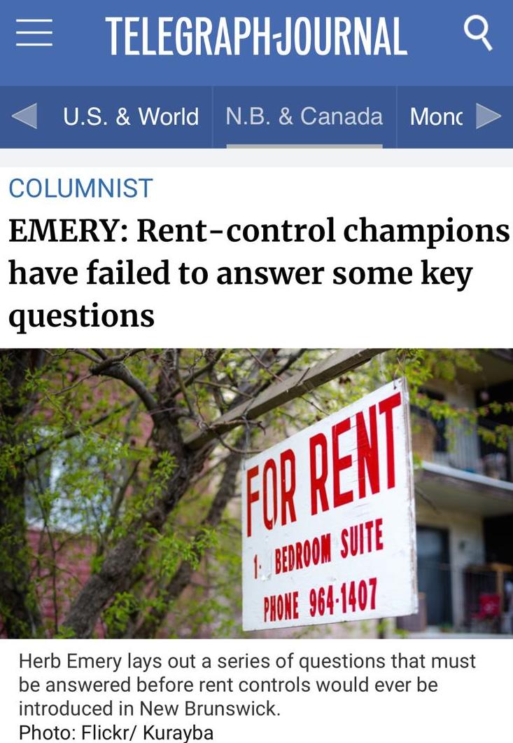 It was, therefore, a bit of a surprise to see that University of New Brunswick’s Vaughan Research Chair in Regional Economics Herb Emery publish a piece in the Telegraph-Journal on Nov. 2 referencing the Nova Scotia debate in relation to our own proposals to impose rent controls in New Brunswick.