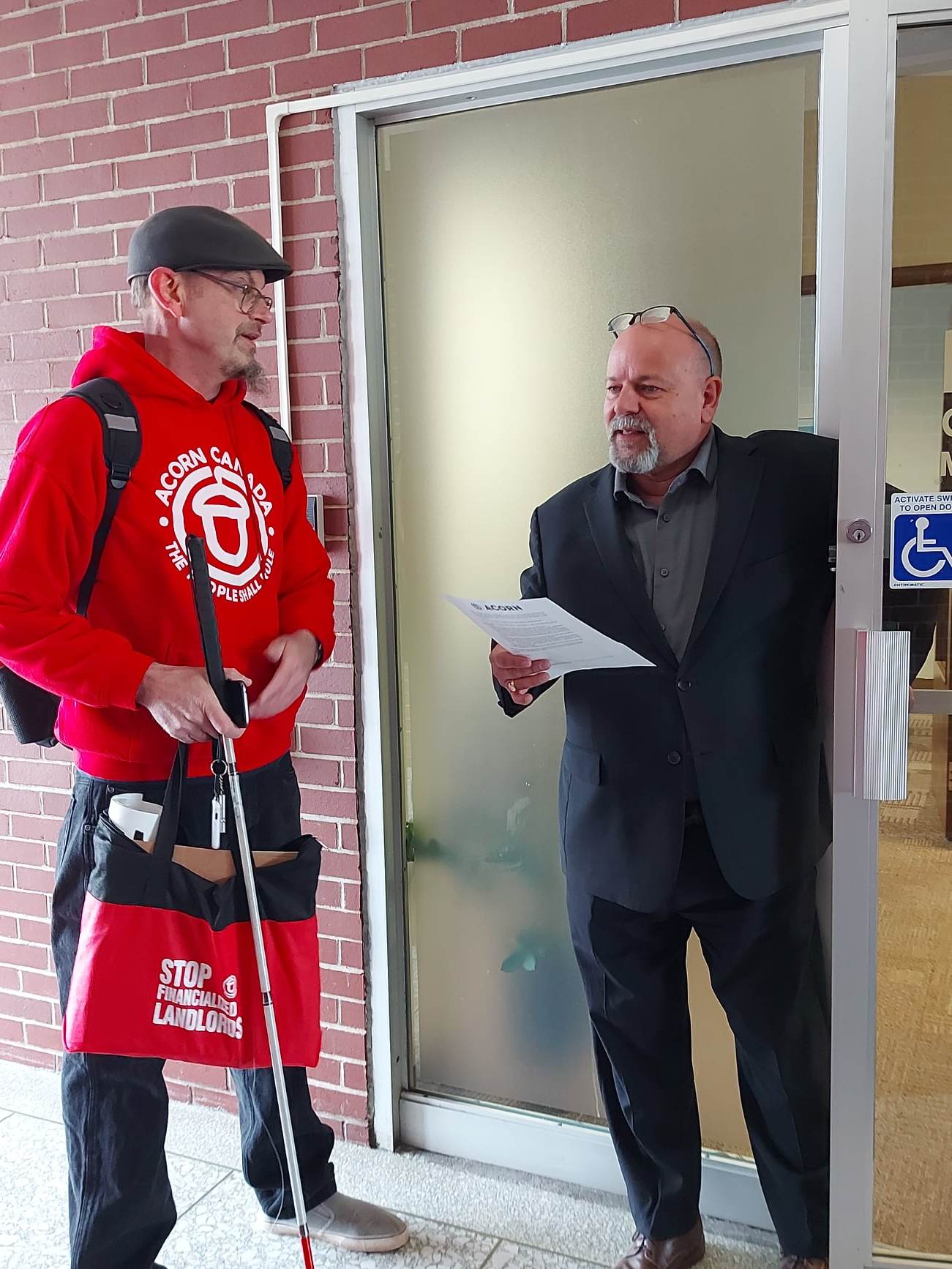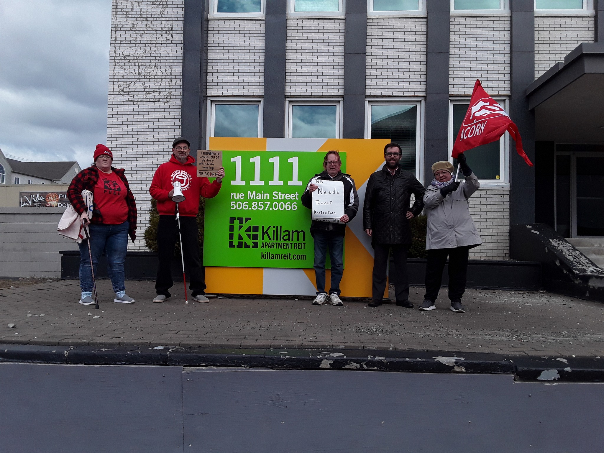 NB ACORN’s co-chairs, Peter Jongeneelen and Vanessa Jones, led the Moncton rally from outside a Killam building on Main Street to MP Ginette Petitpas Taylor’s office to discuss the same issues. Unfortunately, Petitipas Taylor was not in her office, so they spoke to her assistant and handed ACORN’s letter to him.