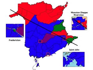 Academics have observed New Brunswick’s political behaviour tends to follow a diagonal line drawn from Moncton to Grand Falls. Historically, Liberal-Conservative divisions have matched this alignment.