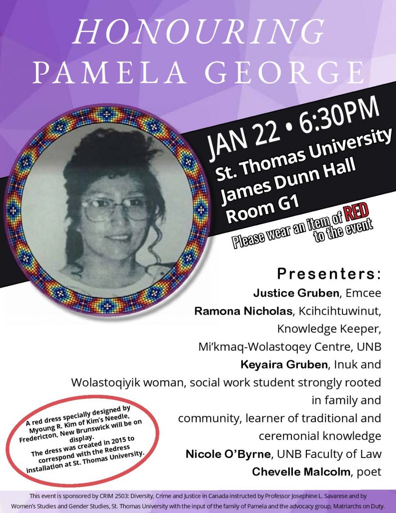 This event will honour Pamela George, an Indigenous woman, mother, provider and poet who was murdered April 18, 1995.